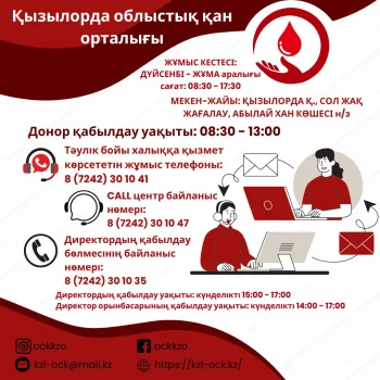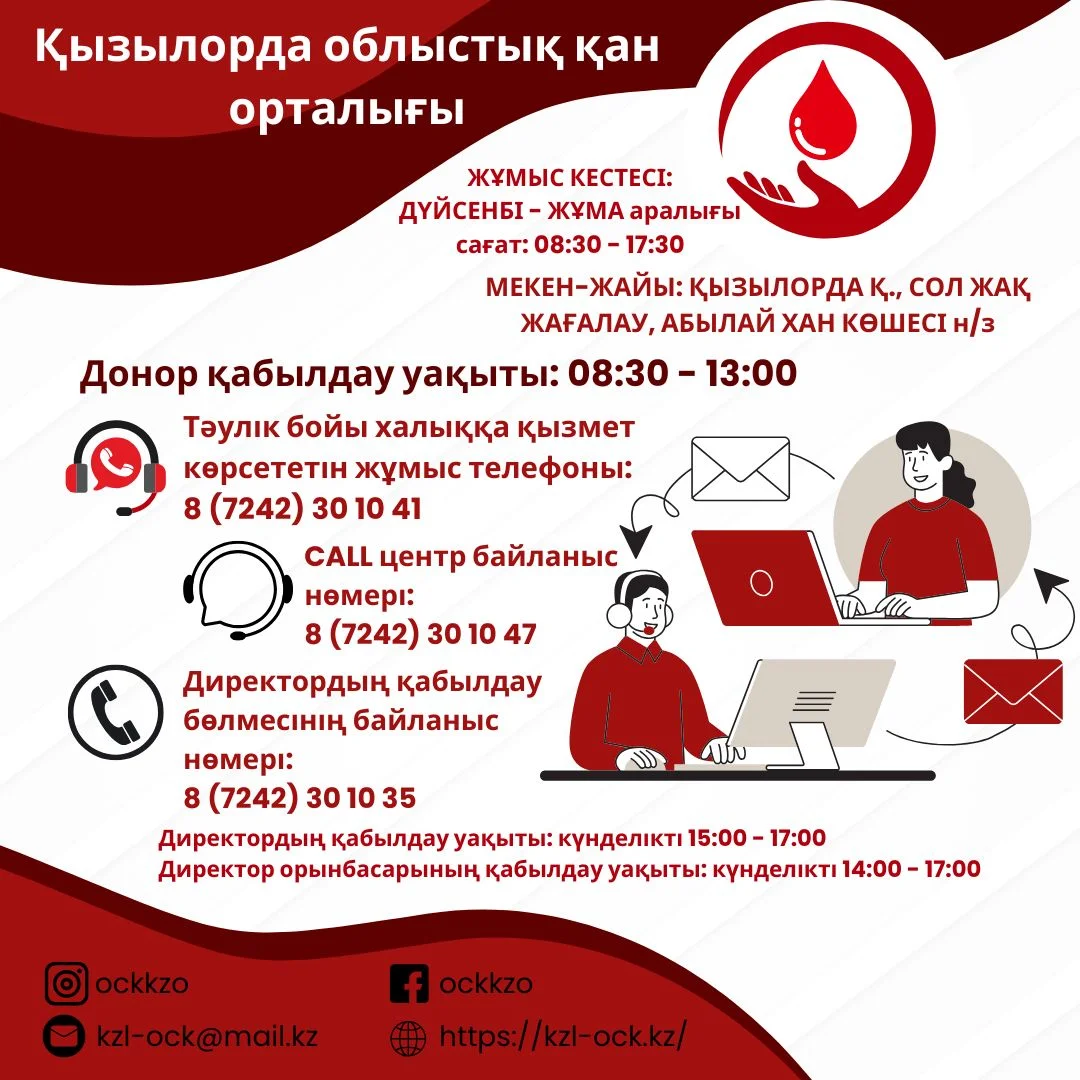 Донорларды жинақтау бөлімшесі: 8-(7242)-30-10-47, 8-777-973-58-58, 8-777-976-59-59