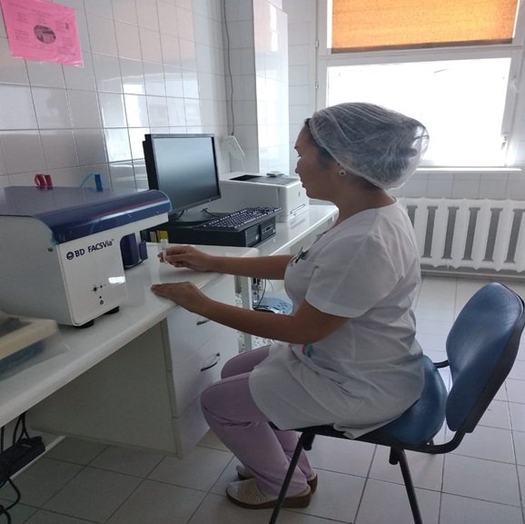 Cапаны бақылау бөлімшесінің аға фельдшер зертханашысы, жоғары санатты, білікті маман Тасымова Назира Ермакқызы автоматтандырылған ағынды цитометр «BD FacsVia» аппаратында қан компоненттерінің қалдық лейкоциттері мен қалдық жасушаларының көрсеткіштерін анықтауда.