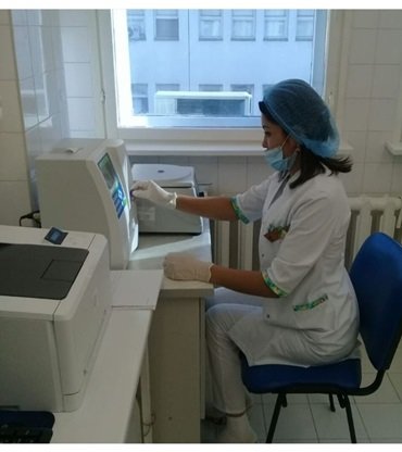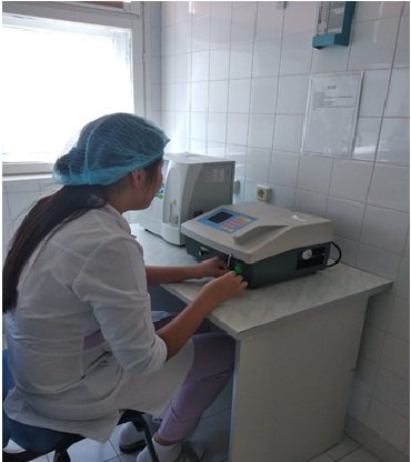 Сапаны бақылау бөлімшесінің фельдшер зертханашысы Қожанберген Мадина жартылай автоматтандырылған биохимиялық талдауыш «АЕ-600» жабдығы арқылы қан компонентінің қалдық ақуыз көрсеткішін анықтауда.