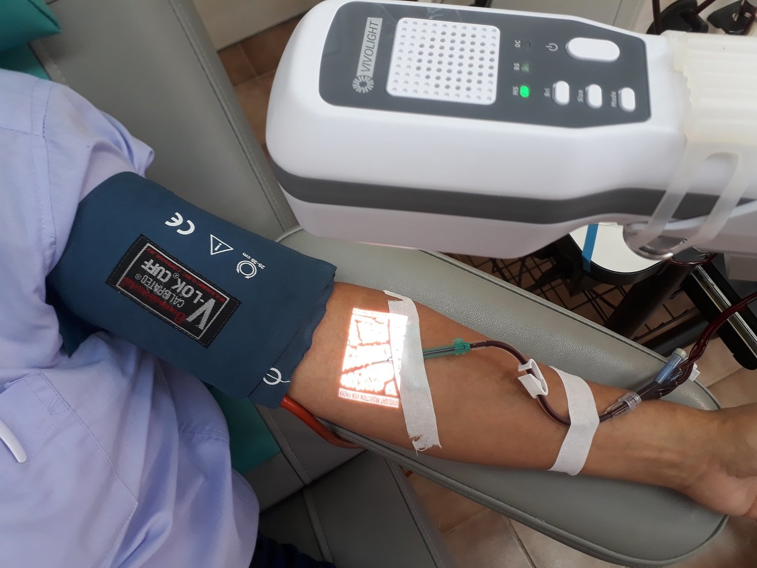 Осы аппарат арқылы қолмен қиын анықталатын қан тамырларын көріп, тамырға дәл түсіп, қан алынуда. Аппарат жылжымалы және тоқпен қуатталады, жұмыс жасауға өте ыңғайлы.